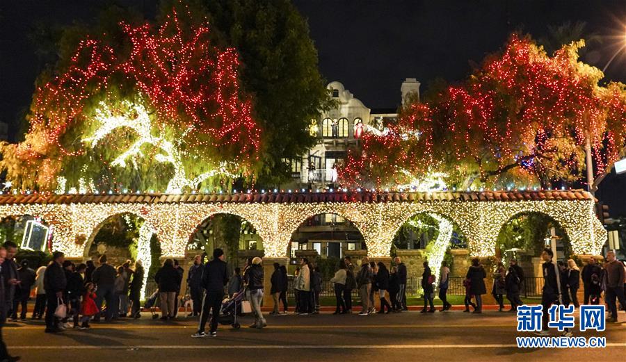 12月29日,人們?cè)诿绹?guó)加利福尼亞州里弗賽德燈光節(jié)上欣賞彩燈。第27屆里弗賽德燈光節(jié)流光璀璨,洋溢著濃厚的新年氣氛,吸引眾多游客前來觀看。 新華社記者李穎攝