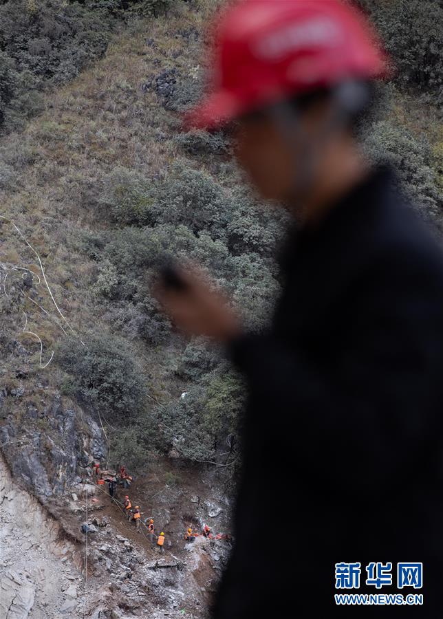 阿布洛哈村通村公路施工遇到陡崖夾溝地勢,項目進程艱難緩慢,四川路橋施工隊伍開始在峽谷兩邊分頭推進(2019年11月20日攝)。新華社記者江宏景攝