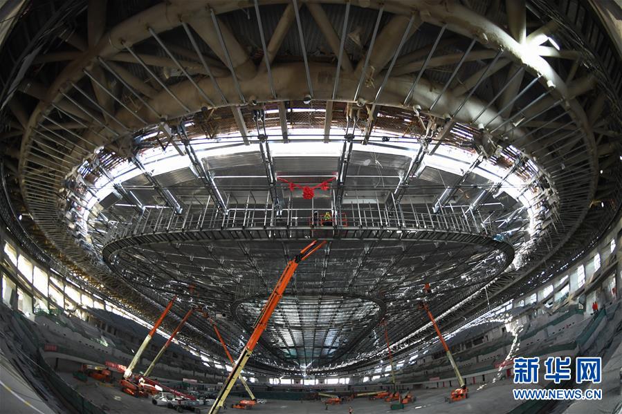 12月31日,施工人員在國(guó)家速滑館施工現(xiàn)場(chǎng)安裝最后一塊屋面單元板塊。新華社記者鞠煥宗攝