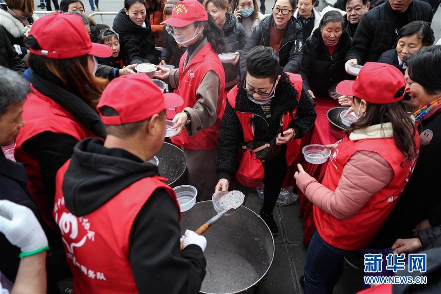 1月2日,志愿者在閬中古城貢院廣場給大家發(fā)放臘八粥。 當日是農(nóng)歷臘月初八臘八節(jié),四川閬中古城舉行“萬人同品臘八粥”活動,當?shù)鼐用窈捅姸嘤慰驮谪曉簭V場免費享用臘八粥。 新華社記者 江宏景 攝