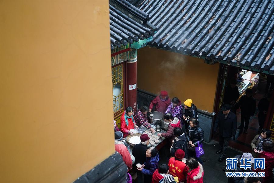 1月2日,在南京玄奘寺,工作人員在給市民贈粥。 當日是農(nóng)歷臘月初八,中國傳統(tǒng)臘八節(jié)。 新華社記者 季春鵬 攝