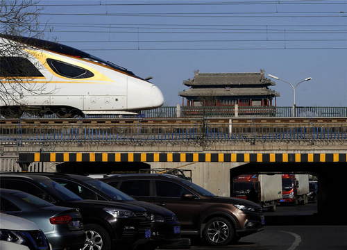 2019年1月25日,一列“復(fù)興號”動車組列車在北京永定門城樓附近的京津城際鐵路上行駛。新華社記者邢廣利攝