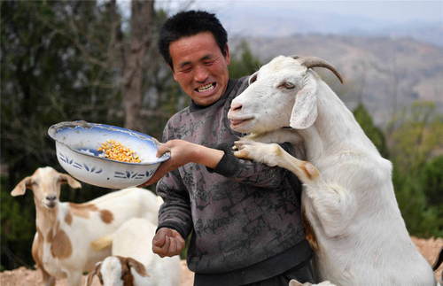 2019年3月27日,在河南省盧氏縣沙河鄉(xiāng)果角村,村民任當(dāng)鋒在喂羊。41歲的任當(dāng)鋒曾多年在外打工,由于腰部有傷不能干重活。2018年,在知悉盧氏縣的金融扶貧政策后,任當(dāng)鋒返鄉(xiāng)創(chuàng)業(yè),用貸來的5萬元無擔(dān)保無抵押小額貸款,購買了38只羊,從打工仔變成了一個羊倌。 新華社記者李嘉南攝