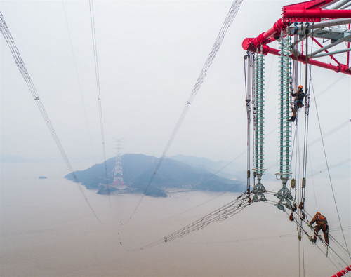 2019年1月3日,施工人員在浙江省舟山500千伏聯(lián)網(wǎng)輸變電工程380米跨海輸電鐵塔上進(jìn)行驗收和消缺作業(yè)(無人機照片)。新華社記者徐昱攝