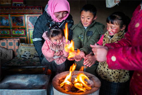 2019年1月17日,西藏班戈縣尼瑪鄉(xiāng)牧民齊美一家在冬季牧民定居點烤火。新華社記者普布扎西攝
