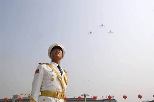 2019年10月1日,慶祝中華人民共和國成立70周年大會在北京天安門廣場隆重舉行。這是空軍方隊接受檢閱。新華社記者劉大偉攝