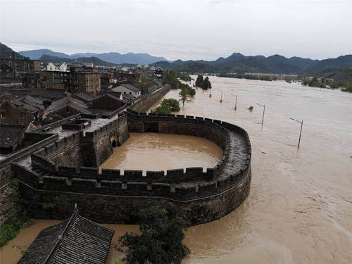 2019年8月,超強臺風(fēng)“利奇馬”引發(fā)的洪水圍困浙江省臨海市。這是8月10日拍攝的被洪水圍困的臨海古城(無人機照片)。新華社發(fā)