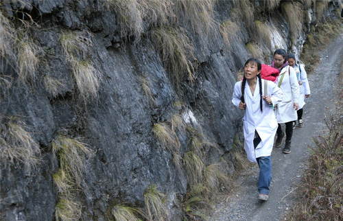 2019年1月13日,在云南省貢山縣丙中洛鎮(zhèn),管延萍(左)與同事走在進(jìn)村的山路上。管延萍從經(jīng)濟發(fā)達(dá)的珠三角地區(qū),自愿到深度貧困地區(qū)云南怒江傈僳族自治州參加?xùn)|西部扶貧協(xié)作,并主動申請將期限從半年延長至3年。 新華社記者張加揚攝