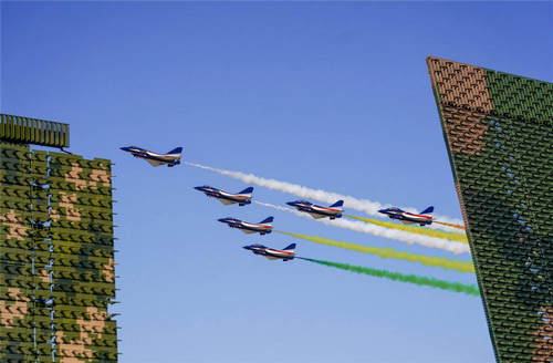 2019年10月21日,在吉林長春舉行的慶祝人民空軍成立70周年航空開放活動上,空軍八一飛行表演隊殲-10飛機編隊從靜態(tài)展示的新型雷達(dá)上空飛過。新華社發(fā)(萬全攝)