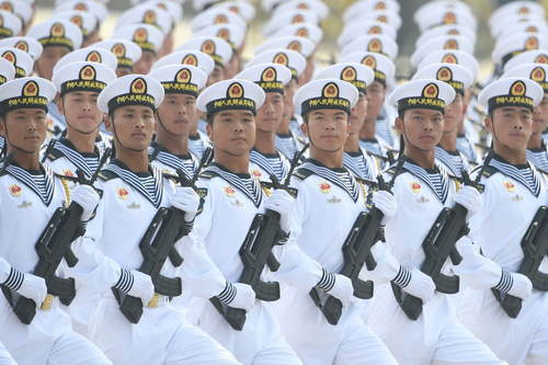2019年10月1日,慶祝中華人民共和國成立70周年大會在北京天安門廣場隆重舉行。這是海軍方隊接受檢閱。新華社記者劉大偉攝