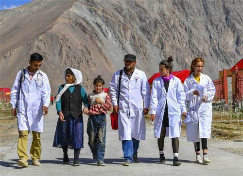 2019年7月7日,新疆塔什庫爾干塔吉克自治縣達(dá)布達(dá)爾鄉(xiāng)熱斯喀木村村醫(yī)發(fā)爾亞特·塔西白克(右三)與來自鄉(xiāng)衛(wèi)生院的醫(yī)務(wù)人員來到熱斯喀木村易地扶貧搬遷安置點出診。從過去騎著馬深入大山牧場巡診,到現(xiàn)在定期前往集中居住點上門服務(wù);從過去幾種簡單的常備藥,到如今種類豐富的各類藥品……新疆牧區(qū)的醫(yī)療條件和水平大幅提升,牧民享受到越來越多、越來越便利的醫(yī)療惠民服務(wù)。新華社記者胡虎虎攝