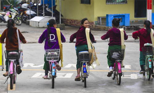 2019年3月8日,在云南省瑞麗市姐相鄉(xiāng)銀井村,銀井小學(xué)幾名緬籍學(xué)生騎車回家,跨過銀井邊防口岸國境線。每天清晨,都有一群孩子通過銀井邊防站,從緬甸來到瑞麗市銀井小學(xué)讀書。新華社記者李曉果攝