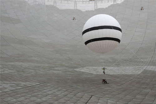 2019年8月30日,在貴州省平塘縣,“微重力蜘蛛人”在500米口徑球面射電望遠(yuǎn)鏡(FAST)上進(jìn)行首次巡檢實驗。FAST調(diào)試組于2017年底開始研制“微重力蜘蛛人”,該方案使用一個直徑7.6米的氦氣球?qū)⒆鳂I(yè)人員體重減少到FAST反射面板能夠承受的重量,使作業(yè)者能夠到達(dá)望遠(yuǎn)鏡反射面任意地方執(zhí)行巡檢和維護(hù)作業(yè)。新華社記者歐東衢攝