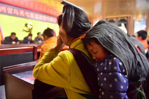 2019年3月14日,一名婦女背著小孩參加烏英苗寨脫貧產(chǎn)業(yè)會議。烏英苗寨位于桂黔交界的大苗山深處,共有140戶600多人,其中100戶屬廣西柳州市融水苗族自治縣桿洞鄉(xiāng)黨鳩村,40戶屬貴州省從江縣翠里瑤族壯族鄉(xiāng)南岑村。這里交通不便,土地資源匱乏,自然環(huán)境惡劣,曾經(jīng)是一個極度貧困的苗寨。2019年,全寨共有44戶貧困戶實現(xiàn)脫貧,貧困戶已從2016年的92戶減少到目前的4戶。新華社記者黃孝邦攝