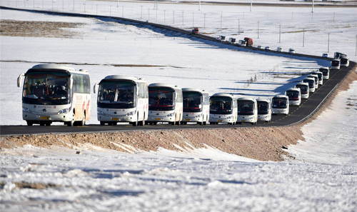 2019年12月23日拍攝的西藏那曲市雙湖縣牧民的遷徙車隊。西藏那曲市雙湖縣嘎措鄉(xiāng)、措折羌瑪鄉(xiāng)、雅曲鄉(xiāng)共2900人,告別了平均海拔5000米的家鄉(xiāng),經(jīng)過近千公里搬遷到海拔相對較低的藏南雅魯藏布江南岸的貢嘎縣境內(nèi)。這是西藏自治區(qū)近年來實施的極高海拔生態(tài)搬遷項目之一,雙湖縣三個鄉(xiāng)的整體搬遷是其中人數(shù)最多、跨度最遠(yuǎn)的一次搬遷。新華社記者覺果攝