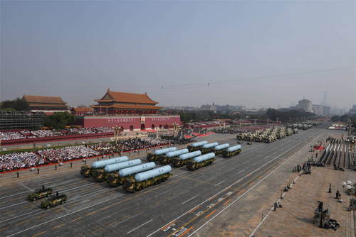 2019年10月1日,慶祝中華人民共和國成立70周年大會在北京天安門廣場隆重舉行。這是巨浪-2導(dǎo)彈方隊和東風(fēng)-31甲改核導(dǎo)彈方隊接受檢閱。新華社記者翟健嵐攝