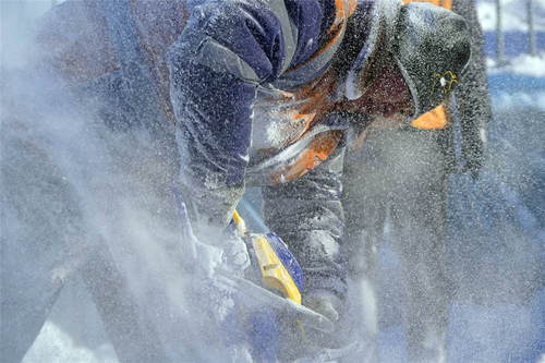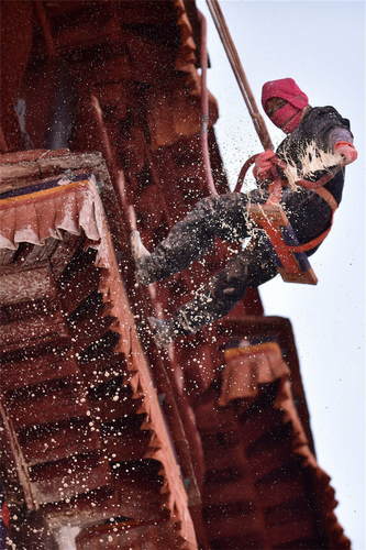 2019年1月23日,在黑龍江省漠河市嫩林線674公里處,加格達(dá)奇工務(wù)段橋隧工杜志彪在進(jìn)行涵洞除冰作業(yè)。新華社記者才揚攝