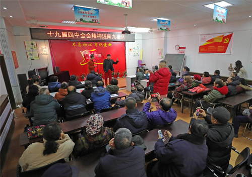 2019年11月26日,遼寧省十九屆四中全會精神曲藝宣講小分隊成員在沈陽市南九社區(qū)活動室表演節(jié)目《大和小》。新華社記者楊青攝