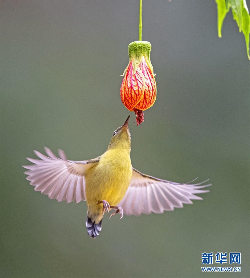在福州市西湖公園,一只叉尾太陽(yáng)鳥在狀如燈籠的懸鈴花前懸停、采蜜(1月3日攝)。 新華社記者梅永存攝