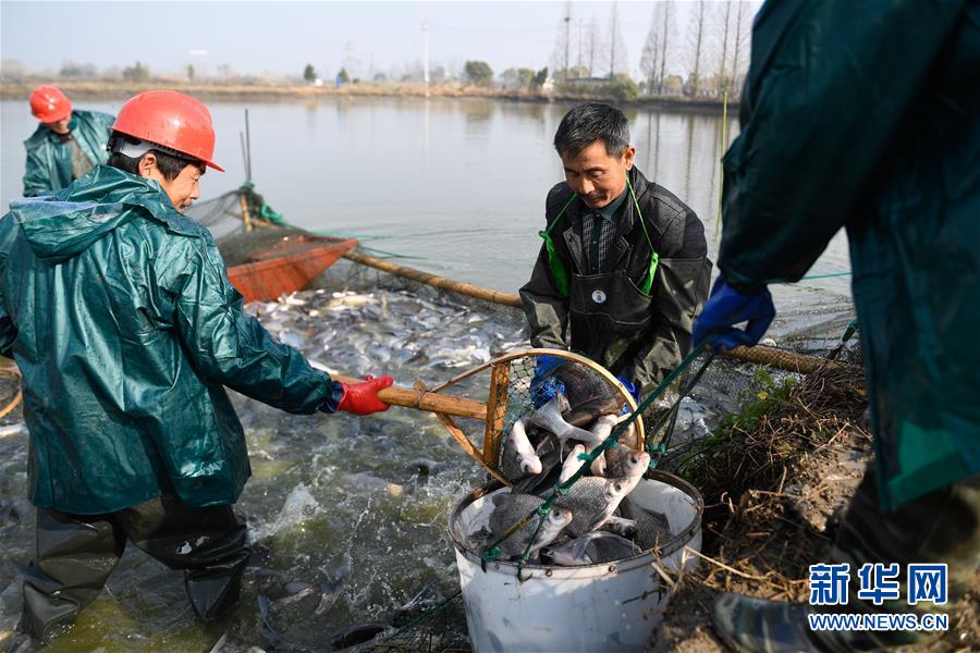 12月28日,漁民們在菱湖鎮(zhèn)盛江家庭農場捕魚。新華社記者黃宗治攝