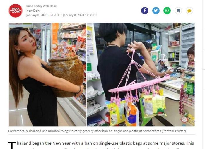 泰國(guó)人用各種創(chuàng)新的方式來(lái)裝購(gòu)買的物品。來(lái)源:《今日印度》報(bào)道頁(yè)面截圖