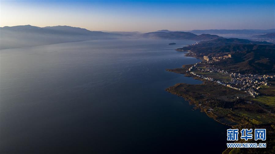 空中俯瞰撫仙湖(無(wú)人機(jī)照片,1月10日攝)。 來(lái)自云南省玉溪市撫仙湖管理局的數(shù)據(jù)顯示,撫仙湖2019年度保持一類水質(zhì),總磷、總氮等數(shù)值較2018年有所下降。 新華社記者 江文耀 攝