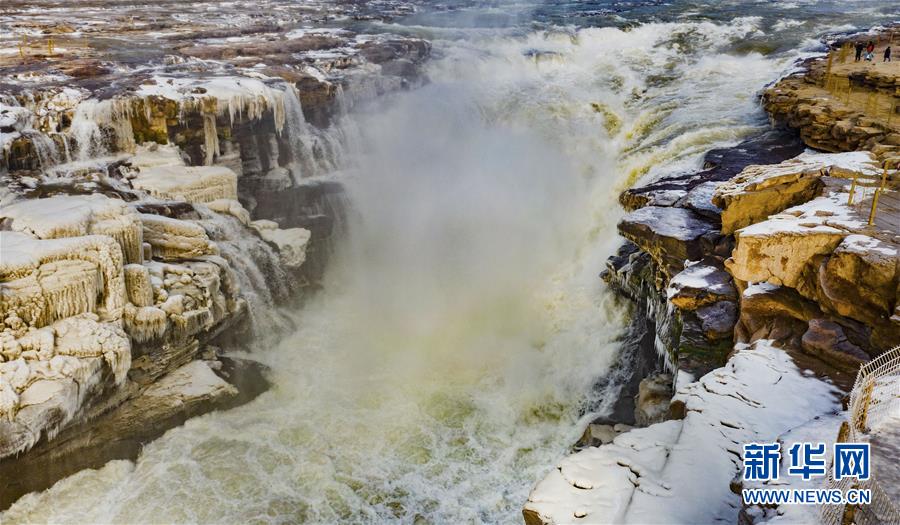 12月14日,游人在壺口瀑布景區(qū)拍照(無(wú)人機(jī)拍攝)。新華社記者陶明攝