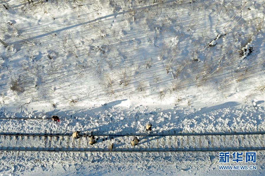 1月7日,西羅奇維修工隊(duì)工作人員在雪地上寫(xiě)下“一路平安”為經(jīng)過(guò)的列車(chē)旅客送上祝福(無(wú)人機(jī)照片)。新華社記者王毓國(guó)攝