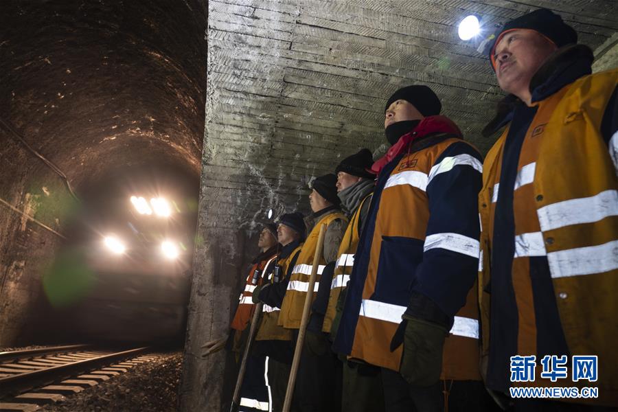 1月9日,在加格達(dá)奇工務(wù)段西羅奇嶺二號(hào)隧道,西羅奇維修工隊(duì)工作人員在避車(chē)洞內(nèi)躲避列車(chē)。新華社記者王毓國(guó)攝