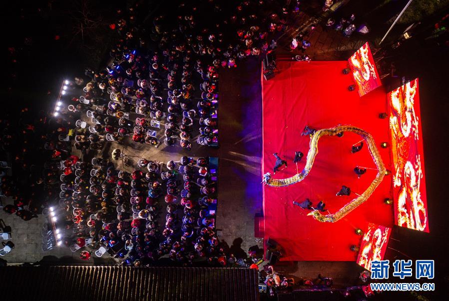 1月14日,杭州市余杭區(qū)中泰街道中橋村的文化公園內(nèi)在進(jìn)行“我們的村晚”舞龍表演,吸引了大批當(dāng)?shù)匕傩沼^看(無人機(jī)照片)。臨近春節(jié),浙江省杭州市余杭區(qū)中泰街道各村社的文化禮堂紛紛上演“我們的村晚”。老百姓自編、自導(dǎo)、自演為主的“土味”聯(lián)歡會(huì)因接地氣、親情濃而深受當(dāng)?shù)匕傩盏南矏?,成為?dāng)?shù)剜l(xiāng)村百姓的新年迎春“文化大餐”。近年來,中泰街道以文化振興助推鄉(xiāng)村振興。目前,中泰街道下屬各村陸續(xù)建成文化禮堂7個(gè)、社區(qū)文化家園2個(gè),努力培育和挖掘出一批鄉(xiāng)土文化人才及原創(chuàng)作品,2019年全年開展各類鄉(xiāng)村社區(qū)惠民文體活動(dòng)累計(jì)180余場次。新華社記者徐昱攝