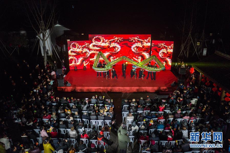 1月14日,杭州市余杭區(qū)中泰街道中橋村的文化公園內(nèi)在進行“我們的村晚”舞龍表演,吸引了大批當(dāng)?shù)匕傩沼^看(無人機照片)。臨近春節(jié),浙江省杭州市余杭區(qū)中泰街道各村社的文化禮堂紛紛上演“我們的村晚”。老百姓自編、自導(dǎo)、自演為主的“土味”聯(lián)歡會因接地氣、親情濃而深受當(dāng)?shù)匕傩盏南矏郏蔀楫?dāng)?shù)剜l(xiāng)村百姓的新年迎春“文化大餐”。近年來,中泰街道以文化振興助推鄉(xiāng)村振興。目前,中泰街道下屬各村陸續(xù)建成文化禮堂7個、社區(qū)文化家園2個,努力培育和挖掘出一批鄉(xiāng)土文化人才及原創(chuàng)作品,2019年全年開展各類鄉(xiāng)村社區(qū)惠民文體活動累計180余場次。新華社記者徐昱攝