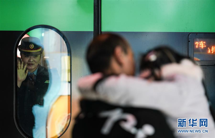1月3日,列車即將離開(kāi)南昌西站,車內(nèi)的卞菁(左)向丈夫和女兒告別。新華社記者 胡晨歡 攝