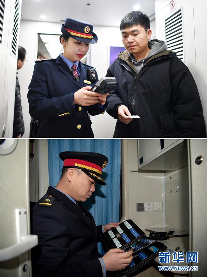 拼版照片上圖:在太原南開(kāi)往西安北的D2507次列車(chē)上,列車(chē)長(zhǎng)陳海燕(左)幫助乘客辦理補(bǔ)票業(yè)務(wù)(新華社記者詹彥1月11日攝);下圖:在陽(yáng)泉北站,列車(chē)長(zhǎng)趙耀在查看臥鋪車(chē)票(新華社記者楊晨光1月11日攝)。新華社發(fā)