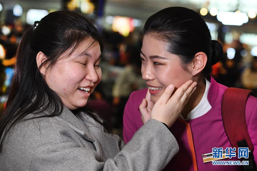 盲人姑娘吳瀟(左)從西安北站中轉(zhuǎn)回延安老家,得到吉如的溫馨服務(wù)。臨別時(shí),吳瀟激動地說:“小姐姐,你的服務(wù)太貼心了,我看不見你,能摸摸你的臉頰嗎?”(1月15日攝)。新華社記者陶明攝