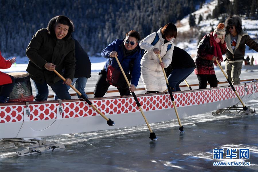 1月18日,游客在新疆天池景區(qū)玩冰上龍舟。新華社記者 沙達(dá)提 攝