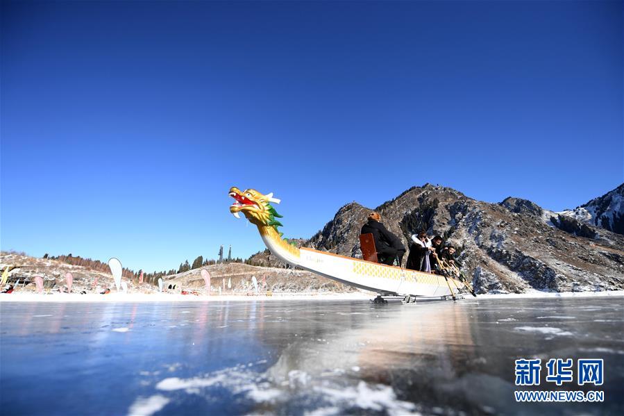 1月18日,游客在新疆天池景區(qū)玩冰上龍舟。新華社記者 沙達(dá)提 攝