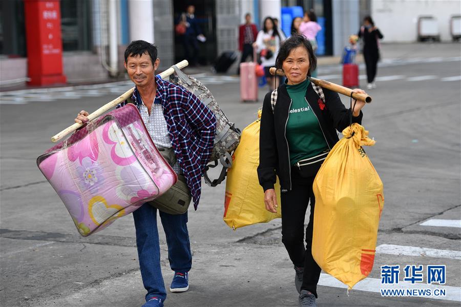 1月19日,來(lái)自湖南的務(wù)工人員在??谛阌⒏圯喍纱a頭登船返鄉(xiāng)。 新華社記者 郭程 攝