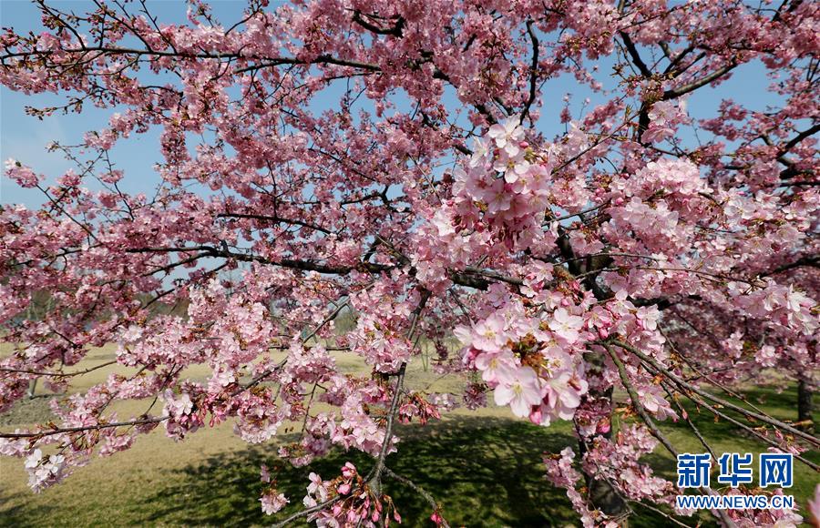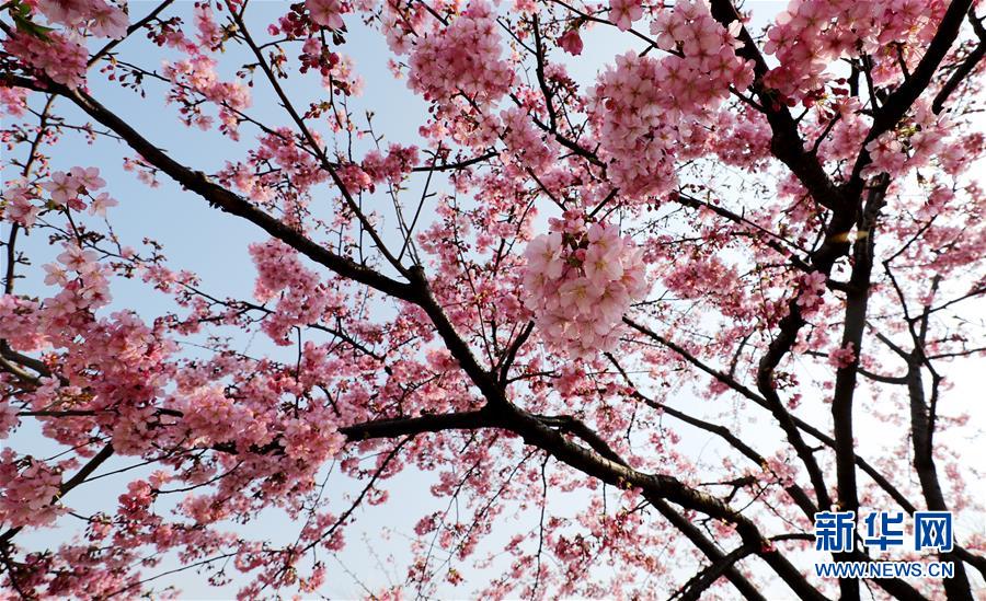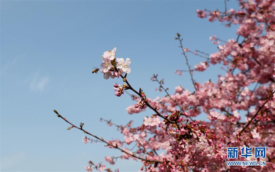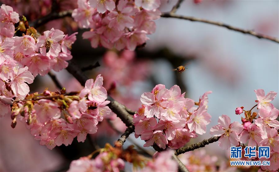2月24日,蜜蜂在上海松江辰山植物園內(nèi)盛開的河津櫻櫻花叢中飛舞。近日,上海松江區(qū)辰山植物園內(nèi)的河津櫻絢麗綻放,花團(tuán)錦簇間一派盎然春意。  新華社記者 方喆 攝