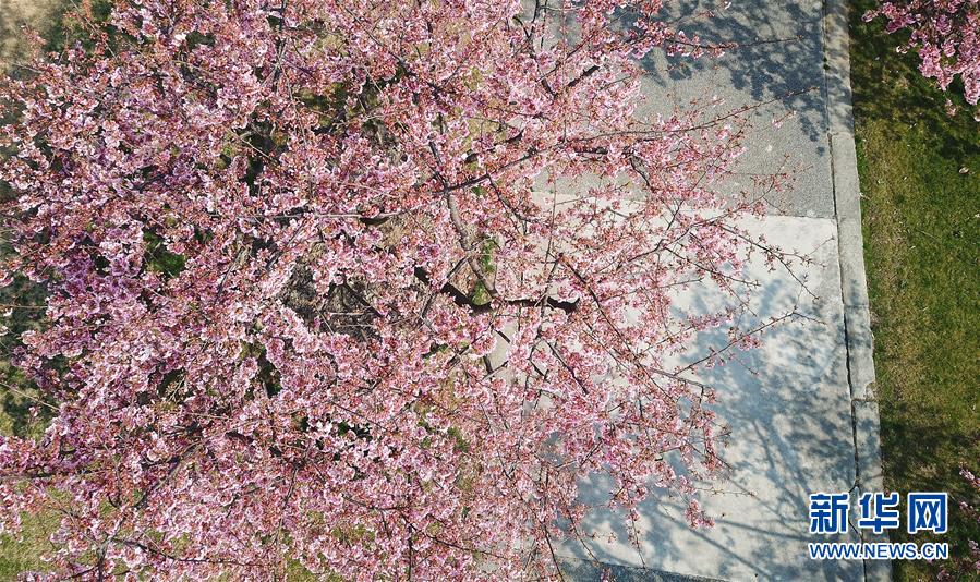 這是2月24日在上海松江辰山植物園內(nèi)拍攝的櫻花小徑(無人機(jī)照片)。  新華社記者 方喆 攝