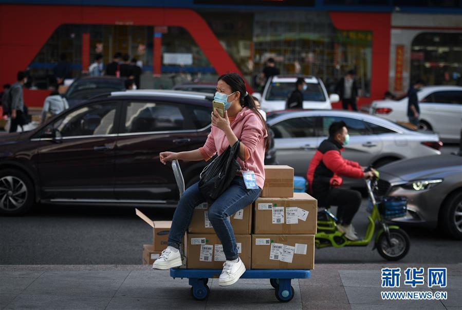 2月24日,在深圳華強北街頭,人們帶著口罩搬運貨物。 新華社記者 毛思倩 攝
