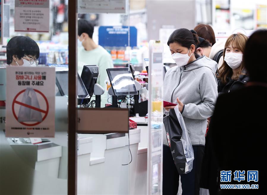 2月24日,在韓國首爾,當?shù)鼐用裨邶埳絽^(qū)一家日用品商店排隊結賬。 新華社記者 王婧嬙 攝