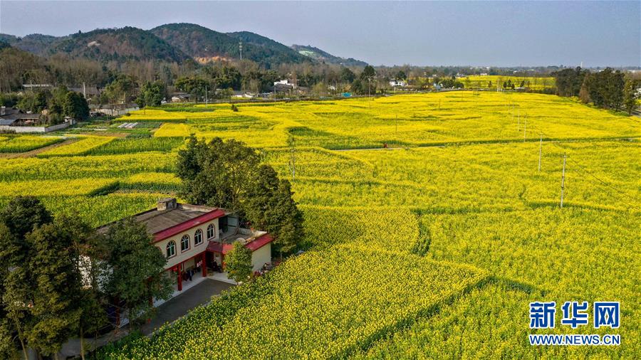 2月25日在四川省崇州市拍攝的油菜花田(無(wú)人機(jī)照片)。  新華社記者 王曦 攝