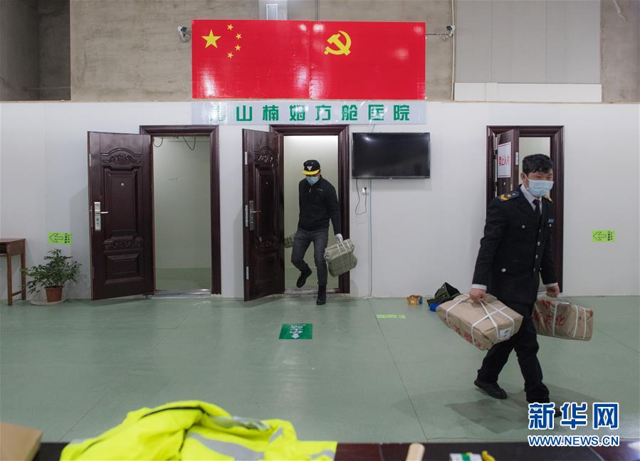 2月25日,在青山楠姆方艙醫(yī)院,工作人員在現(xiàn)場(chǎng)忙碌。  新華社記者 肖藝九 攝