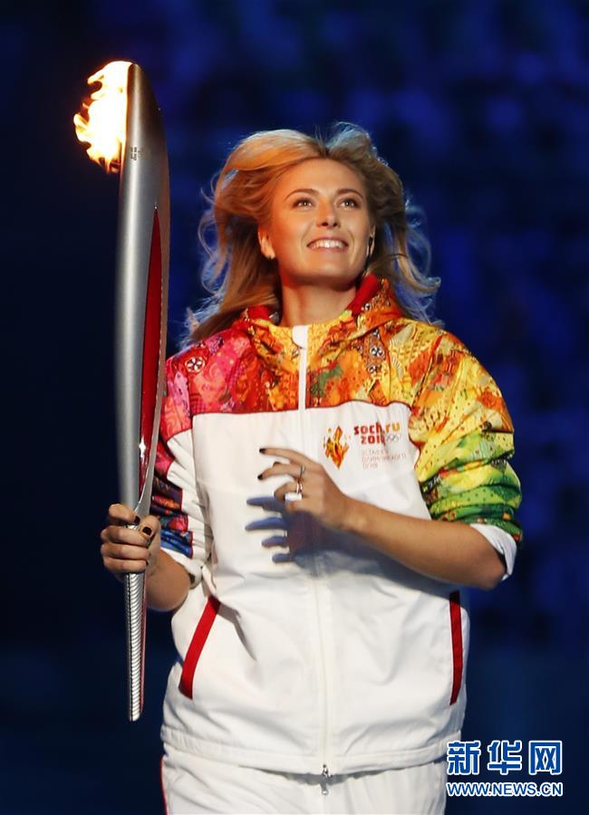 圖為2014年2月7日,莎拉波娃在索契冬奧會(huì)開幕式上手持火炬進(jìn)行傳遞。 新華社記者王麗莉攝