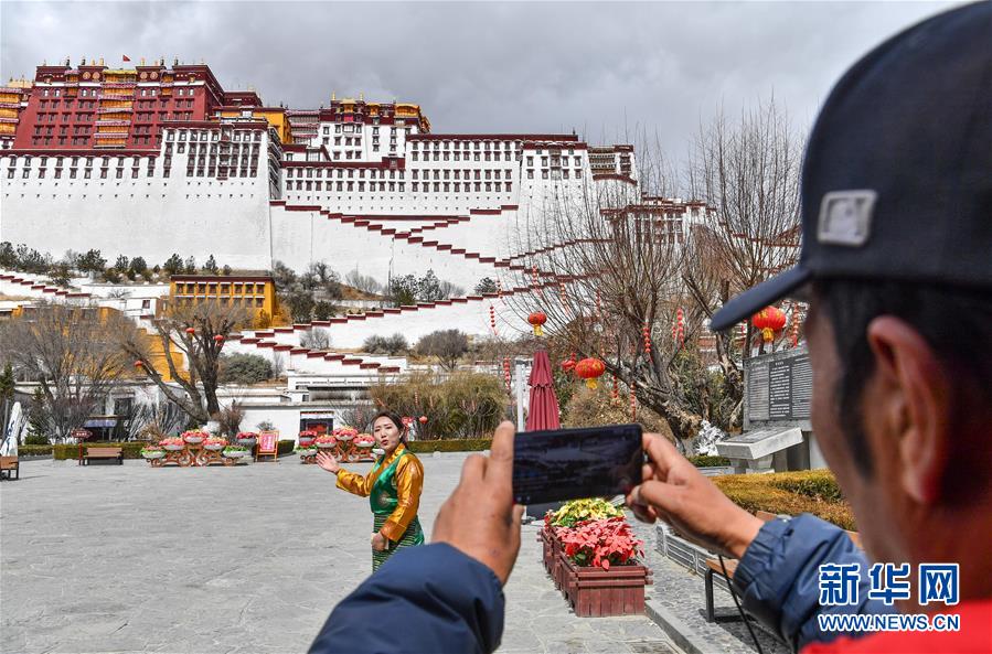 3月1日,布達拉宮管理處講解員次仁卓嘎(左)在進行直播。新華社記者晉美多吉攝
