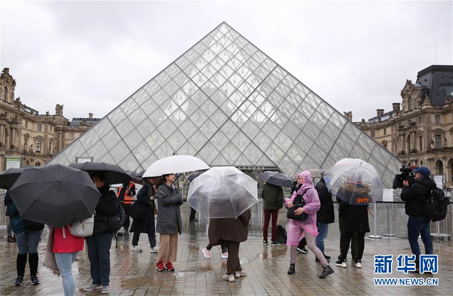 3月2日,在法國巴黎,游客撐傘走過盧浮宮的玻璃金字塔。新華社記者 高靜 攝