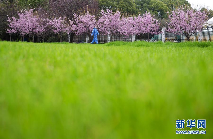 3月3日,一名工作人員從盛開(kāi)的櫻花樹(shù)下走過(guò)。 新華社記者 費(fèi)茂華 攝