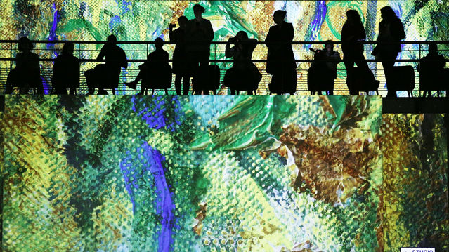 2月27日,在法國(guó)巴黎,人們?cè)凇稄哪?、雷諾阿到夏加爾:地中海之旅》光影藝術(shù)沉浸展的媒體預(yù)展上參觀。新華社記者高靜攝