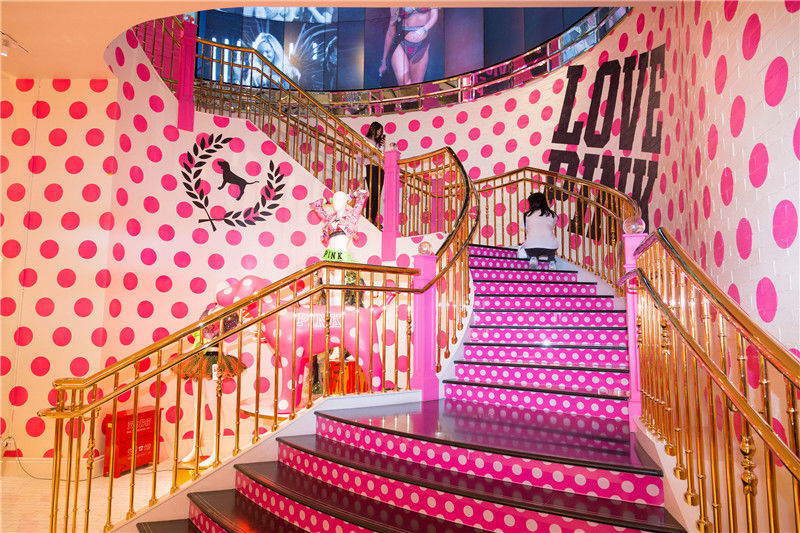 2018年5月17日,北京王府井維密旗艦店。店內(nèi)旋梯很漂亮,上下一共3層,1、2層巨大的環(huán)形電視墻,播放著維密超模走秀的視頻,地下一層粉嫩的風(fēng)格粉嫩,充滿了少女心。劉鋒/千龍圖像/視覺中國(guó)