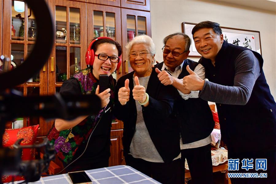 武凌云(右一)一家人在為觀看直播的醫(yī)護人員加油(3月6日攝)。
